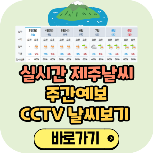 아래에서 제주 지역별 주간 날씨 예보(주요 지역, 오름, 도로 상황, 한라산 기상, 해상 상태)와 실시간 기상 정보를 확인할 수 있는 CCTV 보는 방법을 확인하실 수 있습니다.